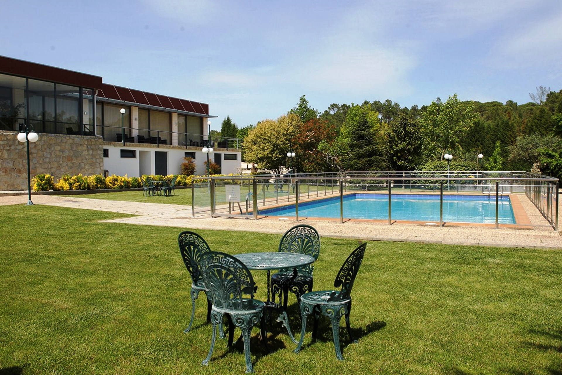O salão principal, com capacidade para até 500 convidados, adapta-se a diferentes configurações e estilos de evento. No exterior, os amplos jardins e a piscina oferecem um cenário idílico para receções ao ar livre, sessões fotográficas e momentos de convívio.